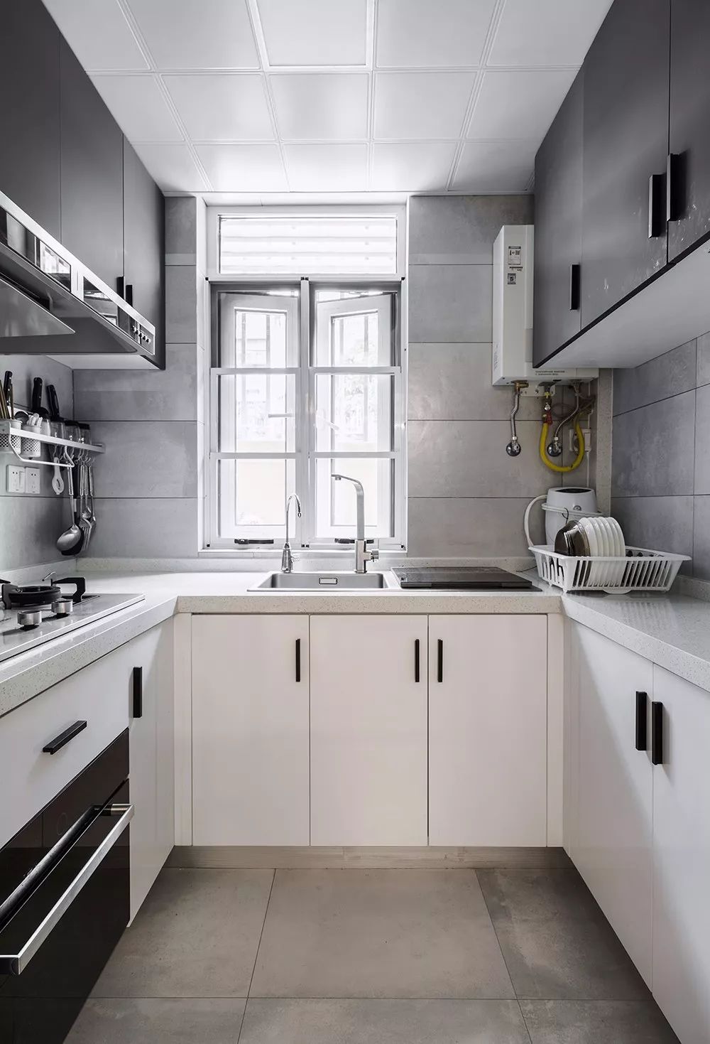 厨房:空间不算小,做 U 字型橱柜布局,最大化利用操作空间;墙面也装了置物架等收纳工具,厨具、调料能有序摆放;为保证光线流通,厨房与餐厅之间未做隔断和门,让空间更显通透。