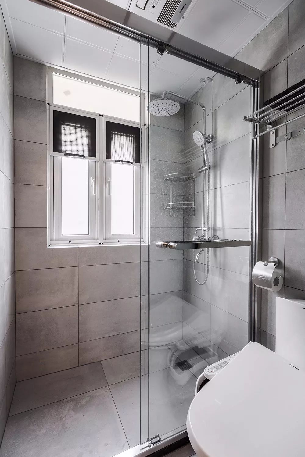 卫生间:内部做干湿分离,淋浴区与马桶之间用玻璃隔断隔开;整体以灰色为主色调,既时尚简洁,又耐脏易打理,日常清洁更省心。