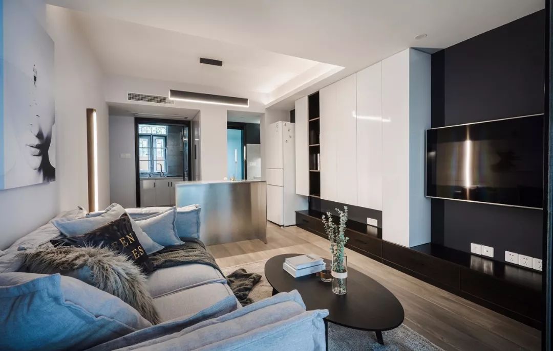 50㎡长条型单身公寓:简约风 + 多光源,吧台餐厅 + 客厅设计超吸睛!