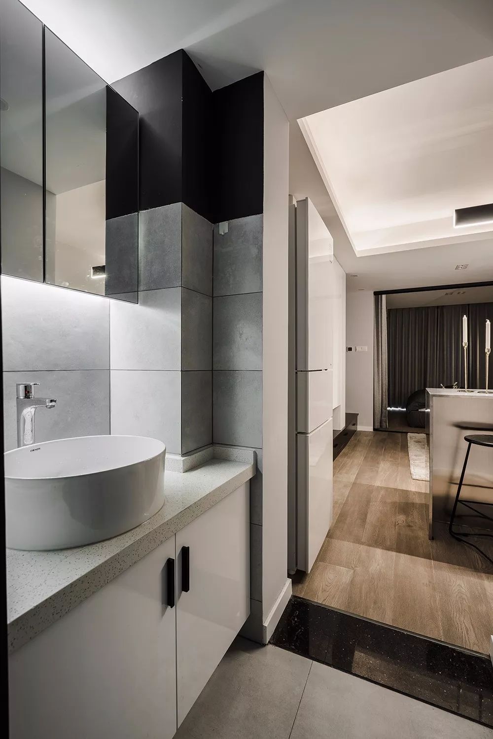 入户玄关走廊做了嵌入式巧思:将卫生间洗手台移到玄关门外,搭配带藏光的镜柜,以灰色与白色为主色调 —— 既避免了玄关走廊因无自然光而显得昏暗压抑,又让洗漱动线更灵活,进门就能随手整理仪容。