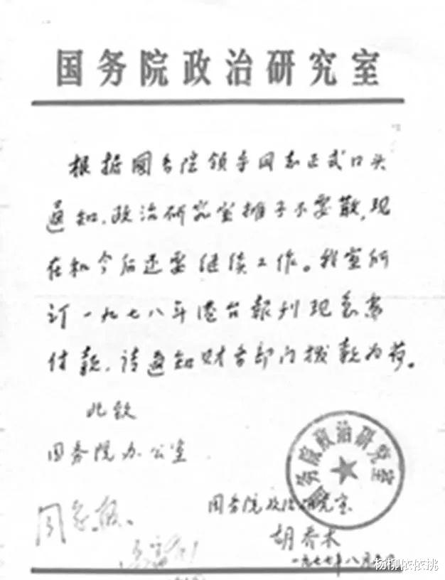 1977年7月17号,中国共产党第十届中央委员会第三次全体会议全体赞成《给邓小平同志恢复职位的决定》,让邓小平重新担任中共中央委员、中央政治局委员、常委、中央副主席、中央军委副主席、国务院副总理、中国人民解放军总参谋长这些要职。到了21号,邓小平在会上发言:“身为一个老党员,能在剩下的日子里给党、给国家、给人民做点力所能及的事,我感到很高兴。”这事儿也让国务院政治研究室撤销的风波有了转机。胡乔木的一份手稿珍贵地记录了这段历史,上面写着:“根据国务院领导同志的正式口头消息,政治研究室不能解散,现在和以后都还得继续干。我们订的一九七八年港台报刊急着要付款,请财务部门赶紧拨款。此致,国务院办公室。”落款是“国务院政治研究室胡乔木,1977年8月5日”。手稿里提到的“国务院领导同志”就是刚恢复领导职位的邓小平,这事儿在《邓小平年谱》里也有记录:“1977年8月3日下午,邓小平和胡乔木、于光远、邓力群聊天,聊到国务院政治研究室时,他说:班子不能散,得留着。以后用什么名头再说,反正理论人才是越多越好。”档案和年谱放在一起看,不仅给历史添上了鲜活的注释,也让我们更清楚地了解那时候政研室工作是怎么变的。之前政研室主要是“整顿”混乱的经济,而现在呢,已经开始从理论层面琢磨怎么消除“文革”十年“左”的影响,学习西方国家的经验和制度,给改革开放扫清思想障碍,提供智慧支持。