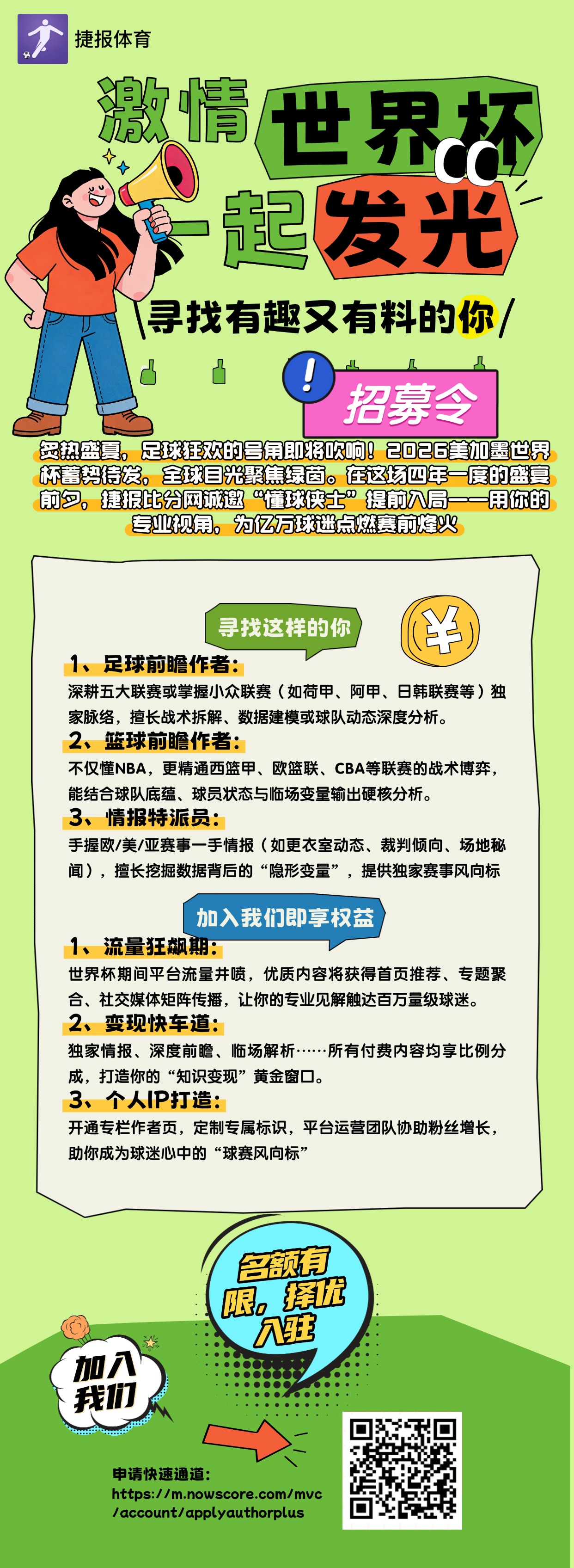 炙热盛夏,足球狂欢的号角即将吹响!2026美加墨世界杯蓄势待发,全球目光聚焦绿茵。在这场四年一度的盛宴前夕,捷报比分网诚邀“懂球侠士”提前入局——用你的专业视角,为亿万球迷点燃赛前烽火!