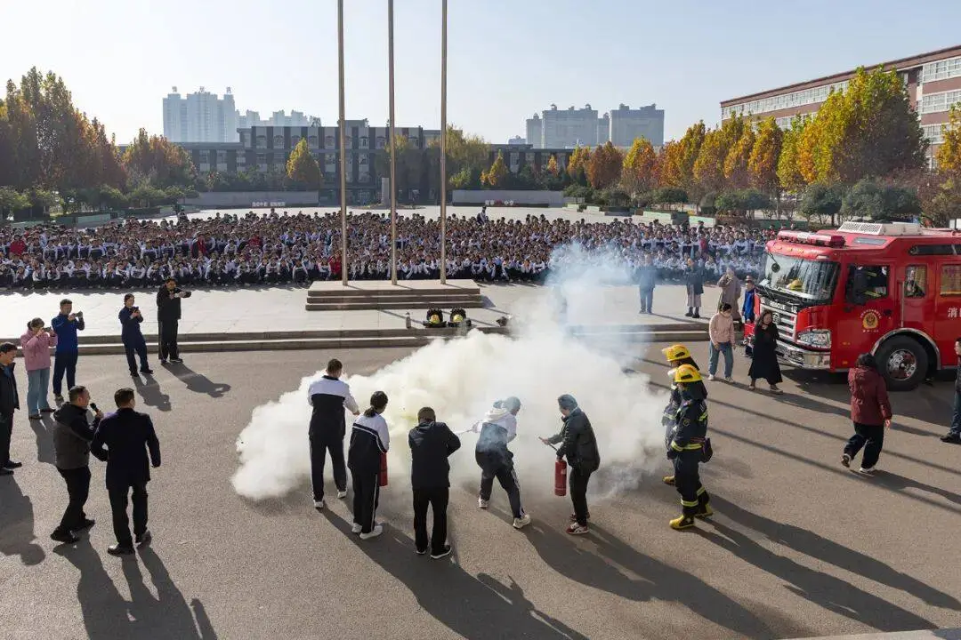 原平市平安大街消防救援站站长助理赵哲给大家讲解并示范灭火器使用方法后,老师和同学们在消防员的指导下,分批次拿起干粉灭火器,进行现场灭火演练。灭火器的黄白色浓烟喷向地上燃起的大火,火迅速被扑灭。随后同学们在消防员的带领下,参观了消防车,并穿戴消防服装,体验了消防员的生活。