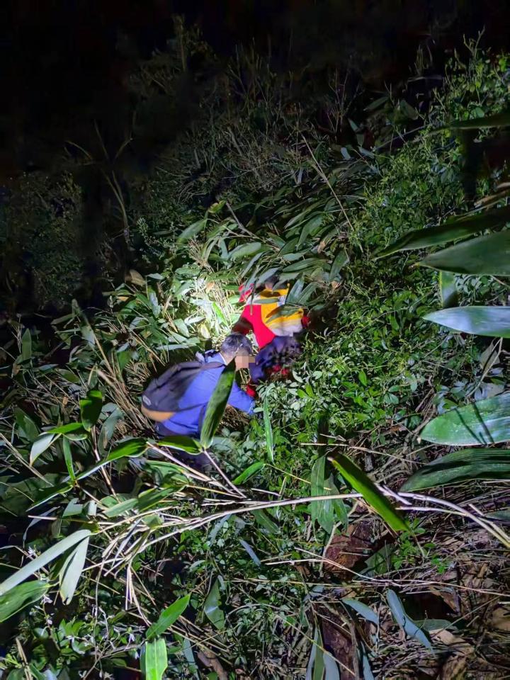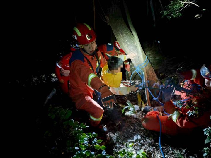 当晚11点左右,救援人员在深山溪流旁找到被困父子二人,确认无明显外伤后,给他们补充物资。随后,救援人员搀扶着父子二人,沿着安全路线逐步撤离,在第二天凌晨3点左右将对方送至安全区域。
