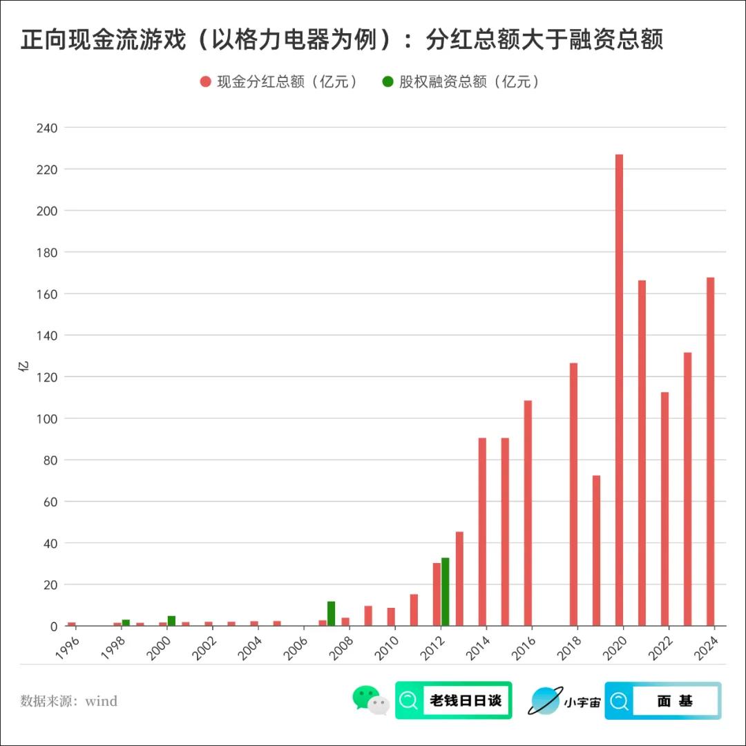 市场整体如此,在具体公司上同样如此。比如种种偏见下的格力电器,这家公司 1996 年上市以来的年化回报率达到近 20%,而这个背后是总计达到 1420亿的现金分红,和同期仅有 52 亿的股权融资。