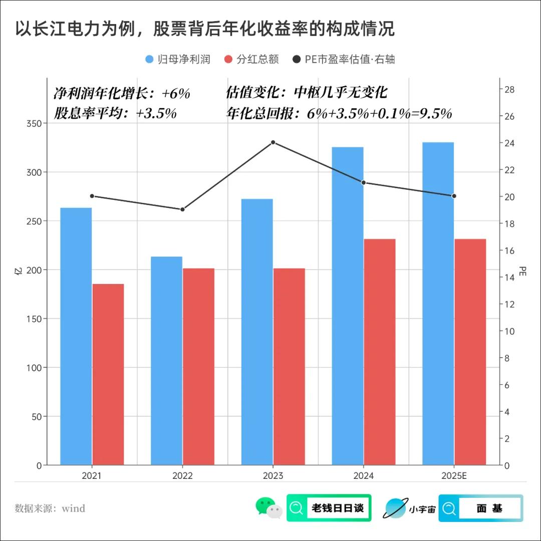 比如大家都戏称长江电力是债券股,但实际上长江电力的收益却远超同期债券,核心便是它依然有着业绩的增长,而如果业绩不再增长,那它的收益来源则仅仅来自于每年 3.5% 的股息率,这样的回报才是真正的所谓的债券股,或者,大家最近爱调侃的,老登股。