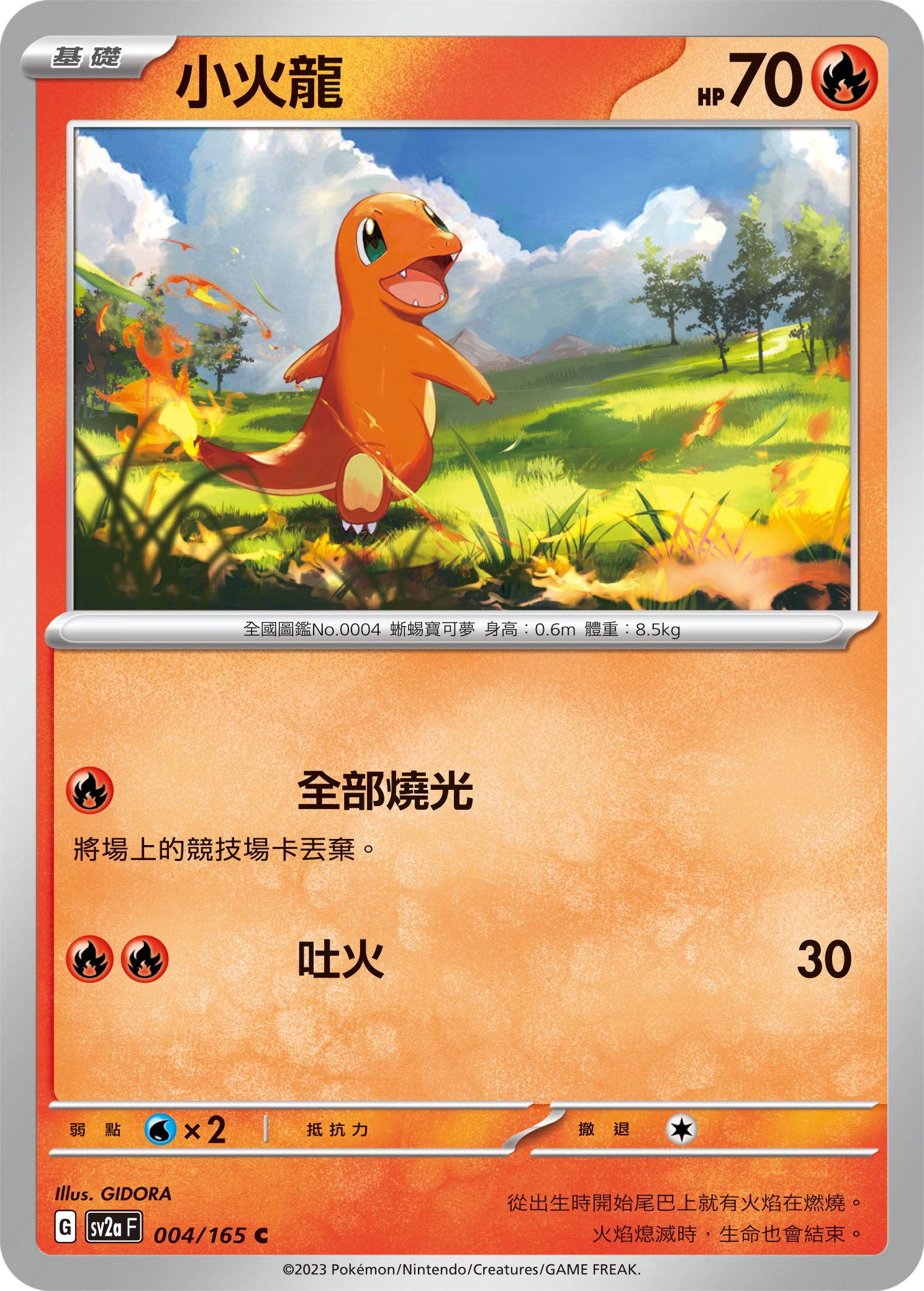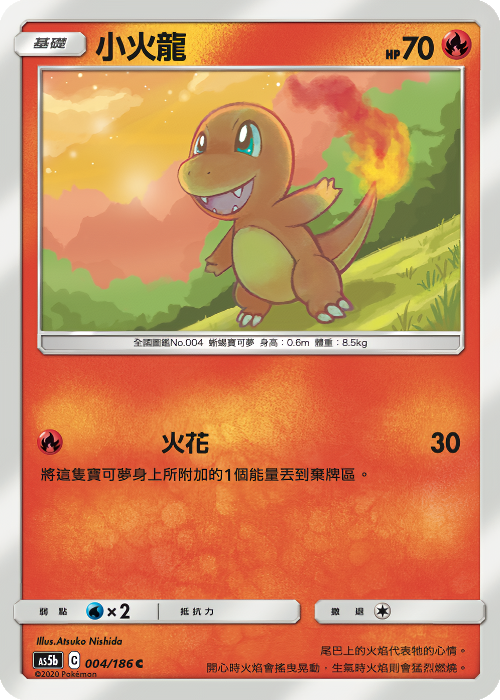 小火龙,蜥蜴宝可梦,属性(火),身高(0.6米),体重(8.5千克),弱点(水、地面、岩石),特性(猛火:HP减少的时候,火属性的招式威力会提高。),隐藏特性(太阳之力:晴朗天气时,特攻会提高,而每回合HP会减少。),所属世代(第一世代),全国图鉴编号(004)。