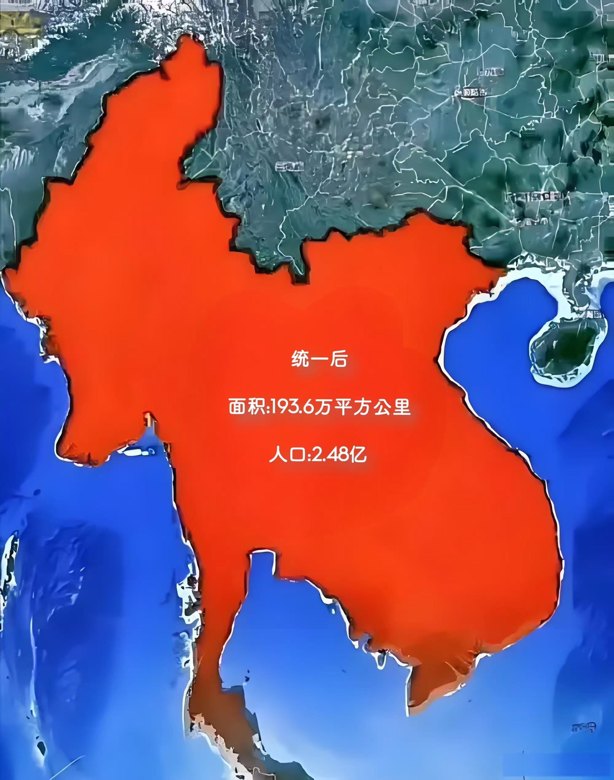 中南半岛统一后,土地面积约有206万平方公里,人口数量约为2.5亿。这样的规模,经济总量按理说是会不断增加的。它的经济总量跟印度、印尼和日本差不多,但现在比欧洲的一些大国要差一些。不过呢凭着丰富的自然资源和巨量的人口,中南半岛的发展潜力还是很大的。