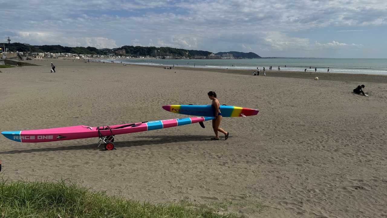 走出来没几步就来到了海边,在各种日剧里看到 镰仓 的海美丽无比,但是今天可能天气有些蒙蒙的,并不那么耀眼,很多冲浪人士在尽情享受,我们在沙滩上坐了一会,快要烤焦了。
