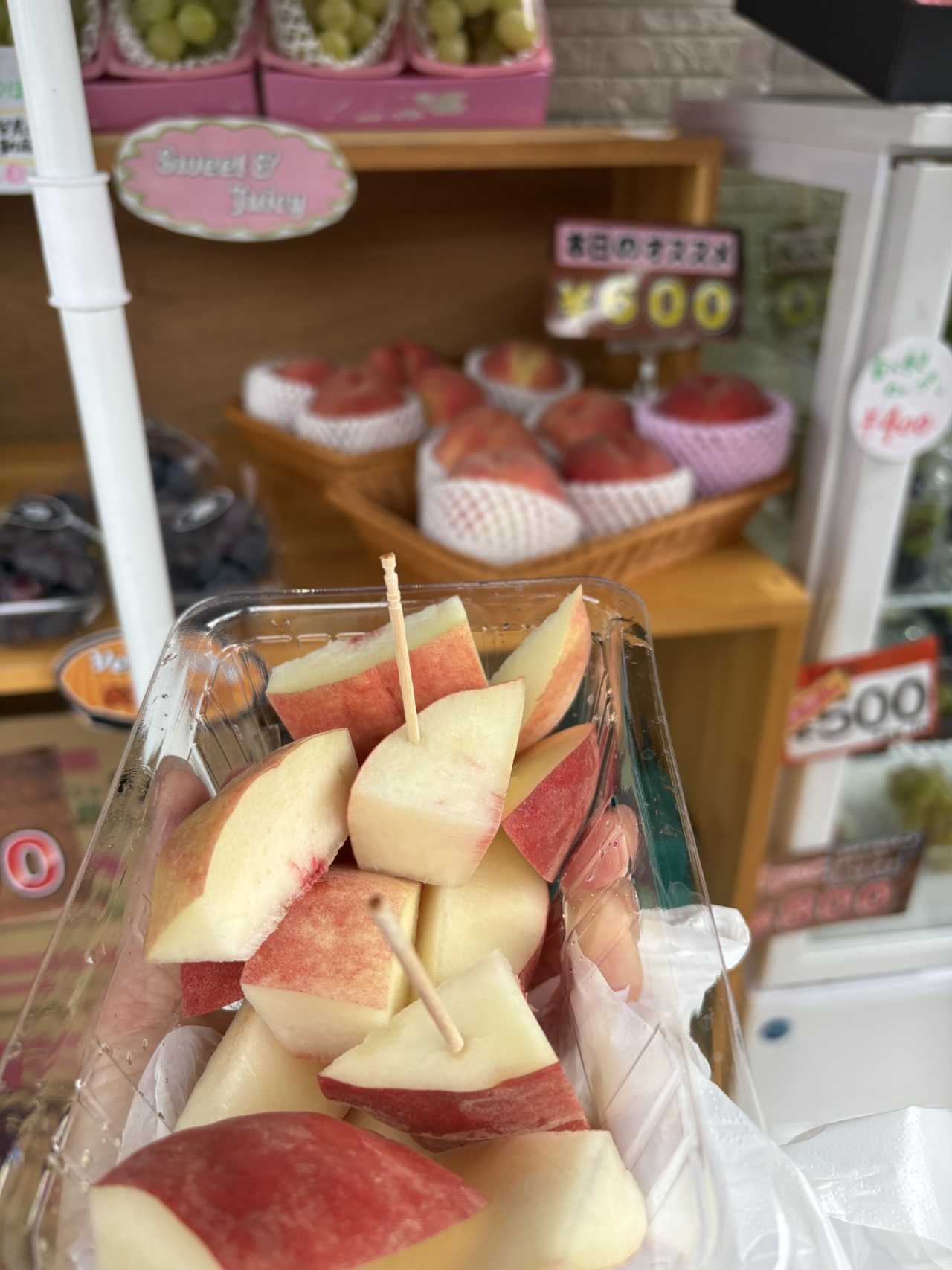 从车站到大佛的一路,两边的小店就各种吸引我,酷热的天气来一个甜美的桃子是个很不错的选择,每个600日元,非常大个又漂亮,售货小妹仔细去核切块,不知不觉我们后面已经排起了队伍等着购买。
