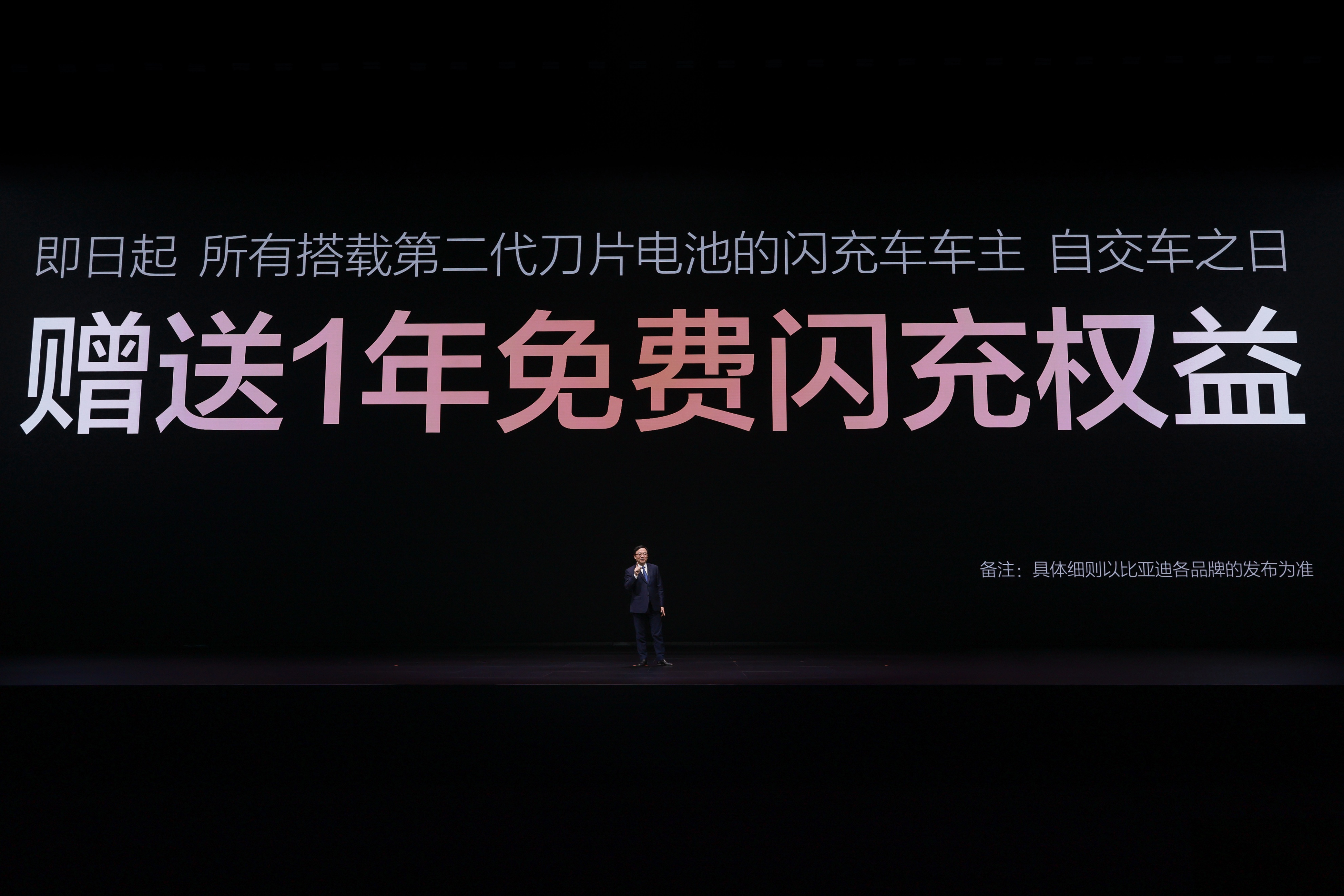 发布会现场王传福宣布,所有搭载第二代刀片电池的闪充车车主,均享有重磅“闪充权益”,自交车之日起,在全国闪充站可享受1年的免费闪充权益,让闪充体验更畅快。并且,在闪充免费期结束后,也会同行业保持一致,不会额外收费。