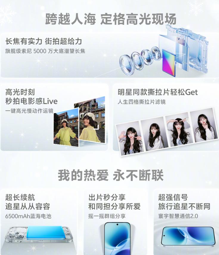 想要追星,手机的长焦实力必须要足够硬核,vivo官方公布,这次的新机将搭载旗舰级5000万索尼潜望长焦,远近都能拍出超高清画质,让用户感受到站姐级的追星体验。同时,新机的长焦Live也十分给力,还新增高光慢动作运镜功能,拍摄变焦+慢动作特效再也不用复杂操作,只需一键即可完成这种特效Live效果!当然还有6500mAh蓝海电池、摇一摇群组分享、寰宇智慧通信2.0等等,新机亮点很足。