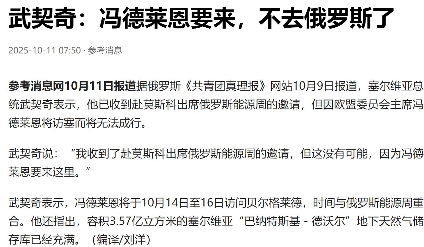 据参考消息报道,日前塞尔维亚总统武契奇对外表示,他收到了出席俄罗斯能源周的邀请,但因为冯德莱恩要来,所以他去不了了。