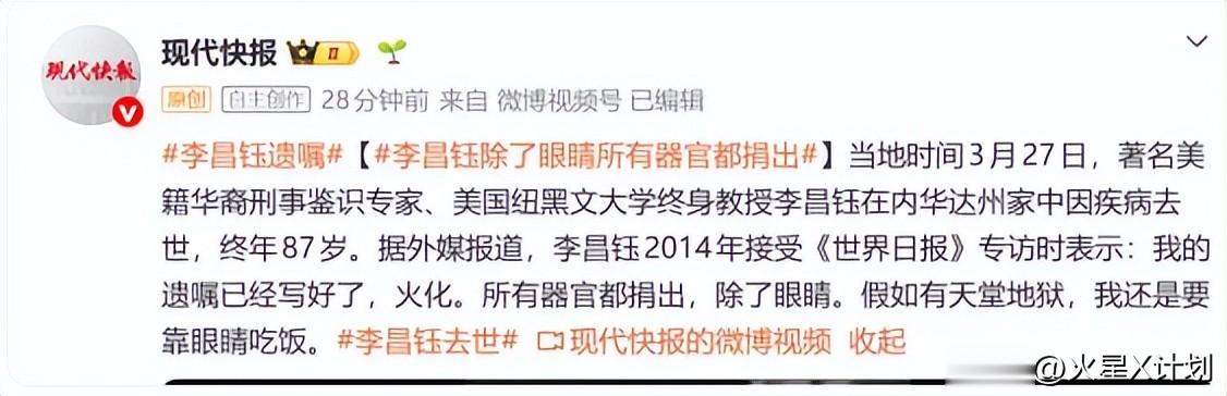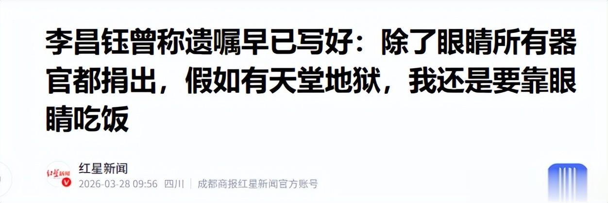 2014年接受媒体专访时,李昌钰就已坦然交代了自己的身后事,他直言遗嘱早已写好,火化后连骨灰都有人订了,所有器官都捐出,唯独保留眼睛。