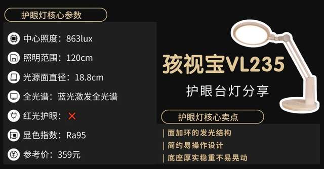 护眼灯哪个牌子更好更专业耐用?孩视宝VL235光线上拥有18.8厘米超大发光面,可覆盖1.2米以上的桌面区域,能满足孩子写作业或阅读的照明需求,同时还配备了智能调光功能,能根据环境亮度自动调节光线强弱。不过由于它采用的是直下式照明设计,光线集中在正前方,书写重影比侧发光款式明显。护眼层面它的蓝光峰值在0.8附近,属于中等水平,同样也是没有红光养眼功能。