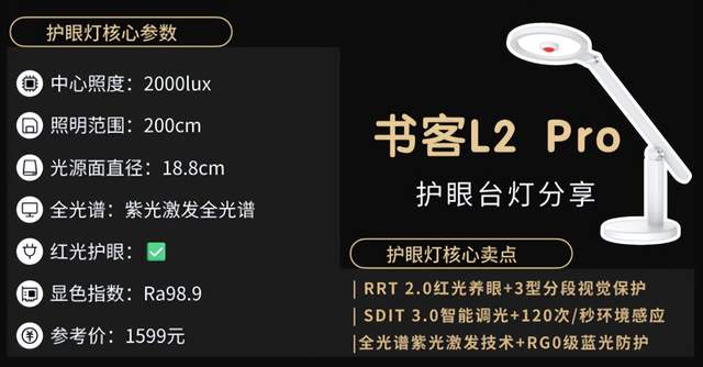 市面上大多数全光谱台灯仍以蓝光激发为主,长时间使用容易引发眼疲劳和视力下降。而书客凭借全新一代紫光激发技术,从根源抑制有害蓝光,同时补充有益天青光、绿光及红光波段,让光线更安全、更柔和。L2 Pro实现了接近“0”蓝光护眼,有效缓解92%用眼疲劳,被专业媒体称为“护眼台灯旗舰体验”,让孩子长时间学习也更安心。