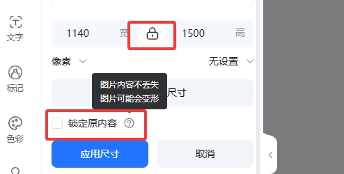 2、“比例锁定”功能:当“宽高比”中间的小锁处于锁住的状态时,当你单个更改宽或者高的数值的时候,那么这张图片就会按照原来的比例来进行缩小或者是放大而不会出现变形的情况;当小锁没有被锁上的时候,则表示你可以完全自主地决定这张图片的新宽和新的高是多少。