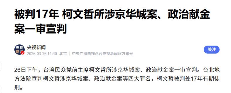 被判17年 柯文哲所涉京华城案、政治献金案一审宣判 央视新闻 2026-03-26 14:40