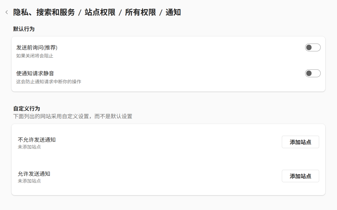 针对浏览器通知,一般可以在浏览器设置 - 隐私和安全中找到通知进行关闭。以Microsoft Edge为例,在设置 - 隐私、搜索和服务 - 站点权限 - 所有权限 - 通知中关闭。