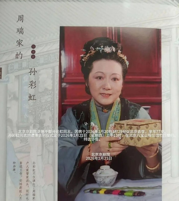2026年1月20日凌晨,北京传来一则令人心碎的消息:87版《红楼梦》中“周瑞家的”扮演者、著名京剧演员孙彩虹,因病医治无效逝世,享年77岁。这位戏里戏外都透着利落与温情的艺术家,终究没能熬过岁月的考验,留给世人无尽的缅怀与惋惜。