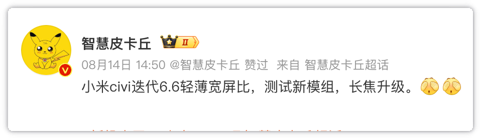 原本喜欢轻薄机的朋友还在担心Civi5 Pro这样的糟糕表现下一代会不会直接被砍掉,没想到答案这么快就揭晓了!8月14日,知名爆料博主智慧皮卡丘发帖称:“小米Civi迭代6.6英寸轻薄宽屏比,测试新模组,长焦升级。”