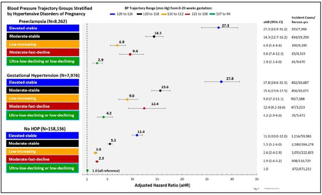 这项研究表明,妊娠前20周的收缩压轨迹与产后2个月至14年的新发高血压风险增加梯度密切相关,风险大小随HDP状态而变化。妊娠后新发高血压风险增加的梯度在每个HDP组中一致,尽管与无HDP的组相比,子痫前期和妊娠高血压组的风险较大。各HDP组的HRs从最低的超低下限组或低下降组到最高的稳定升高的BPT组;子痫前期为2.9~27.3,妊娠期高血压为4.2 ~27.8,与单一参照组相比,无HDP组(HR=1,BPT最低下限或低下降组,无HDP)妊娠后新发高血压的总体风险最低,为2.9~10.96。