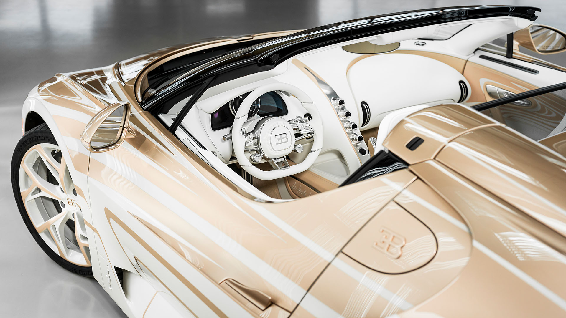 「La Perle Rare」的外观核心,是两套全新研发的专属配色:上半车身采用含金粉的暖调金色,在不同光线角度下呈现珍珠般的虹彩光泽;下半车身则包裹着温润的暖白色,形成“天与地”的视觉对话。这种双色设计看似简单,实则暗藏极致工艺 —— 金白分割线需要技师手工遮蔽、喷涂,仅这一道工序就耗时数百小时,只为确保车身两侧线条完全对称,凸显布加迪对细节的偏执。