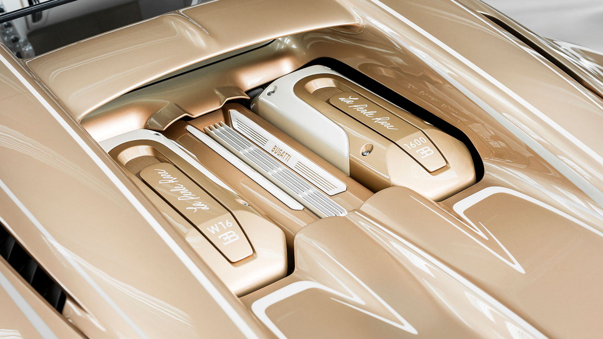 钻石切割合金轮毂采用定制涂装,将车身的金白珍珠质感延伸至车轮,转动时宛如流动的光影;Straub的手写体“La Perle Rare”成为独特标识 —— 刺绣于中央通道、镌刻在专属发动机罩、喷涂在后扰流板下方,这在布加迪定制车型中极为罕见,赋予车辆“设计师亲笔认证”的收藏价值。车身保留W16 Mistral标志性的X型LED尾灯(兼具装饰与散热功能)与车顶双进气口,后者致敬1934年Type 57 Roadster Grand Raid与威龙Grand Sport,既优化空气动力学,又放大W16引擎的轰鸣。