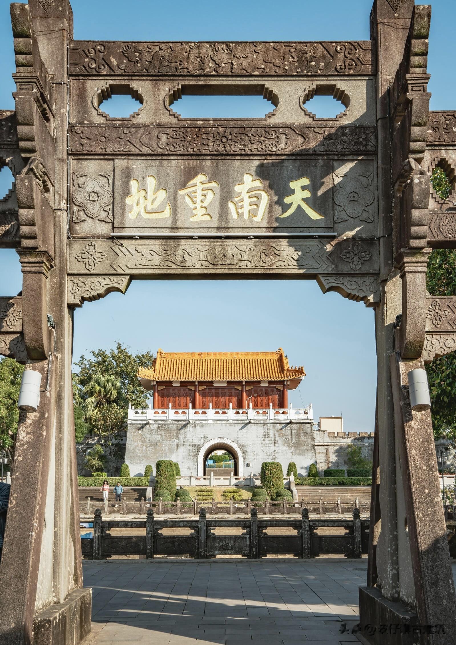 以三元塔为核心建起的三元塔公园,免费向所有人开放,没有门槛,没有喧嚣,是老城最舒服的去处。从正门进去,最先映入眼帘的是仿古城楼广运,城楼不算高大,却透着古朴的厚重,穿过门洞,一汪鉴池静静铺展,水面平静如镜,把古塔的影子完整地收在水里,风一吹,塔影晃动,像是时光在轻轻摇晃。池后的石牌坊格外醒目,四个苍劲有力的大字天南重地,刻在石头上,也刻在雷州的历史里。雷州古称海康,很长一段时间里,这里是雷州半岛的政治、文化、经济中心,是中原文化与海洋文化交汇的地方,是管控南疆、联通海外的关键所在,天南重地这四个字,不是虚名,而是千百年历史沉淀下来的分量。站在牌坊下抬头看,塔身笔直,牌坊沉稳,池水清澈,三者连成一条轴线,像是一条穿越时空的通道,一头连着明代的工匠与文人,一头连着今天的我们。