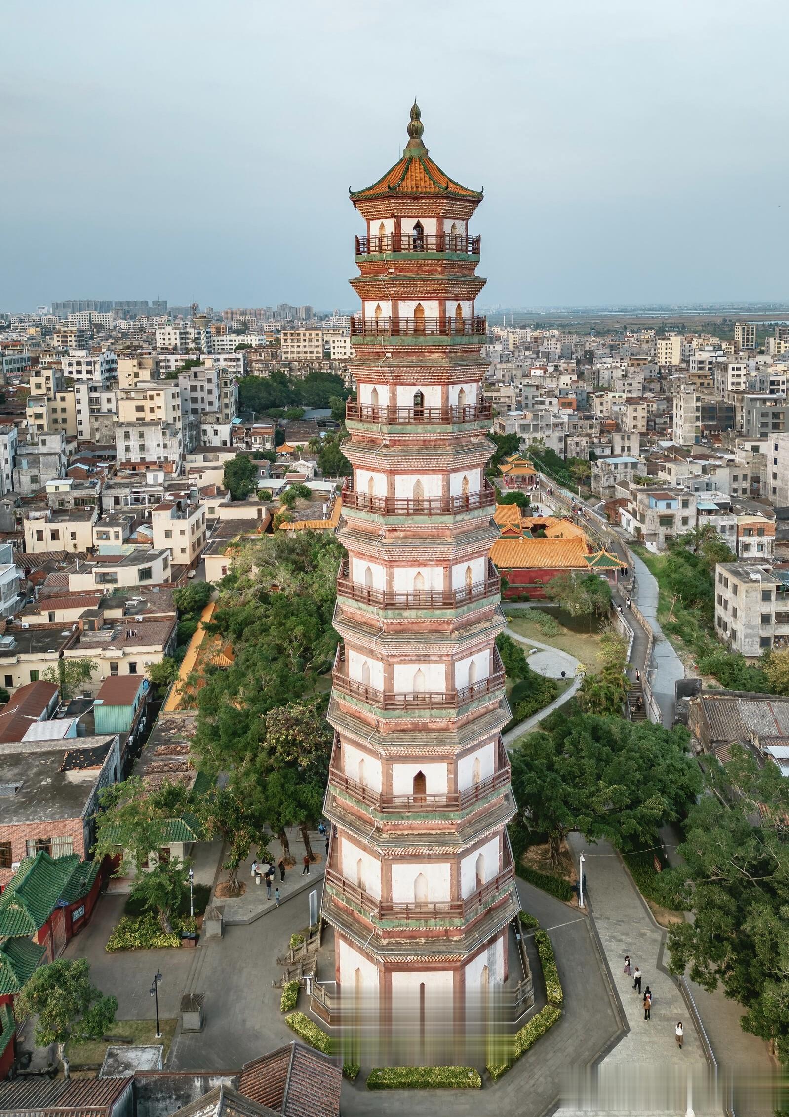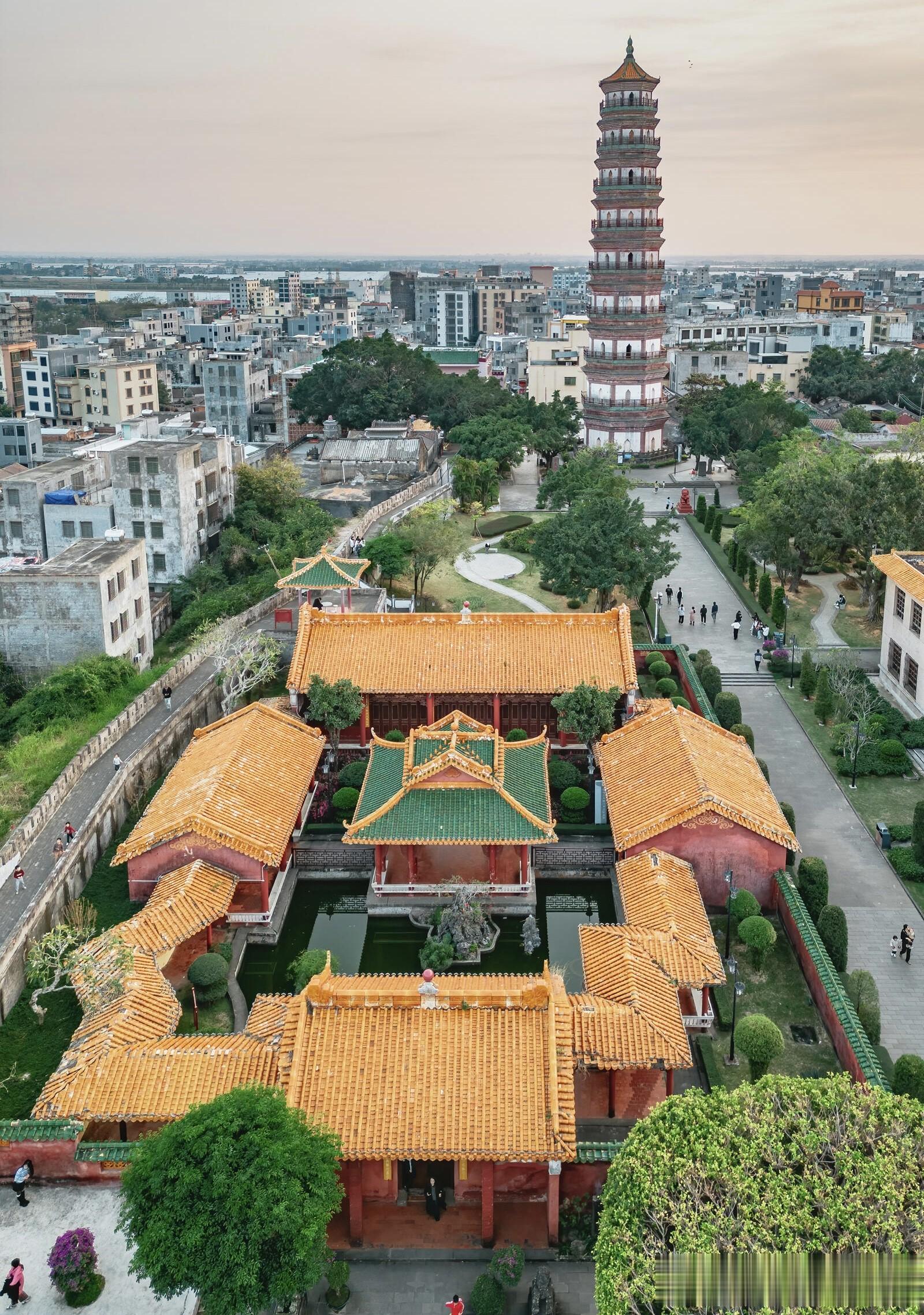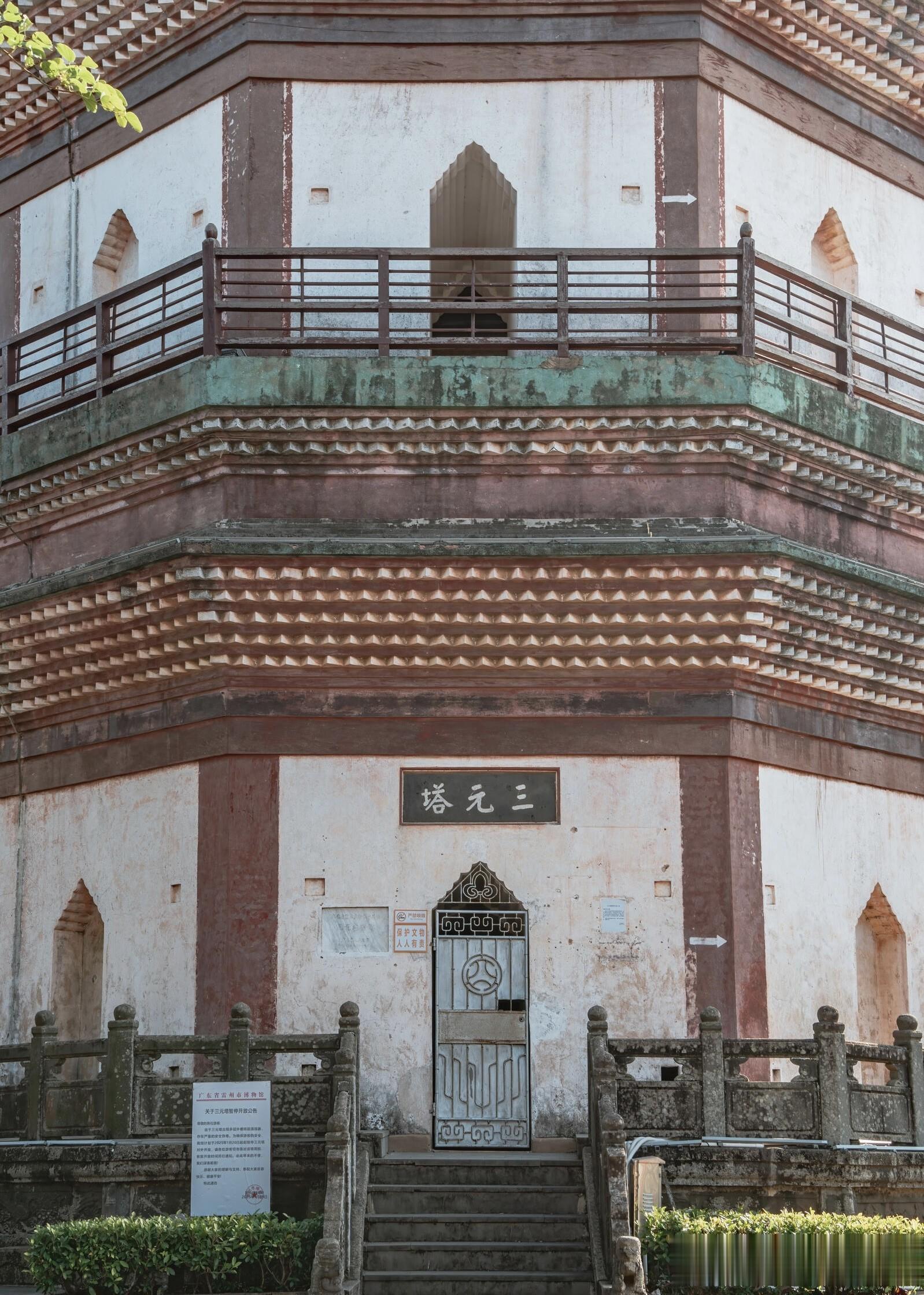 三元塔的高度是五十七米,八边形的塔身笔直向上,没有多余的装饰,却自带一股沉稳的气势。最让人惊叹的是,整座塔通体不用一根木料,全靠青砖层层叠砌而成,在没有现代机械、没有精密仪器的明代,仅凭手工与经验,能把一座近六十米高的砖塔建得如此周正坚固,本身就是一件不可思议的事。当地人口中常说的棱角牙子砖和线砖,是这座塔最独特的印记,工匠们用两种不同形制的砖交错叠砌,让塔身形成清晰又富有节奏的棱角与线条,阳光斜照时,光影在砖缝间错落,一层叠着一层,一圈绕着一圈,像是凝固的乐章,每一道棱角都藏着工匠的巧思,每一块砖都经过精准的打磨。很多人不知道,三元塔外表看是九层,内部实则有十七层,早年还能沿着狭窄的阶梯盘旋而上,一层一层往上走,视野跟着开阔,直到塔顶把雷州全城尽收眼底,青瓦连片,街巷纵横,远处的田野与河流铺展在眼前,那种登高望远的畅快,是只有亲身走过才能体会的震撼。如今为了保护古塔,登塔的通道已经封闭,这成了不少游客的遗憾,可也正是这份谨慎,让这座历经风雨、地震、雷击的古塔,能稳稳地站在时光里,继续陪伴一代又一代人。