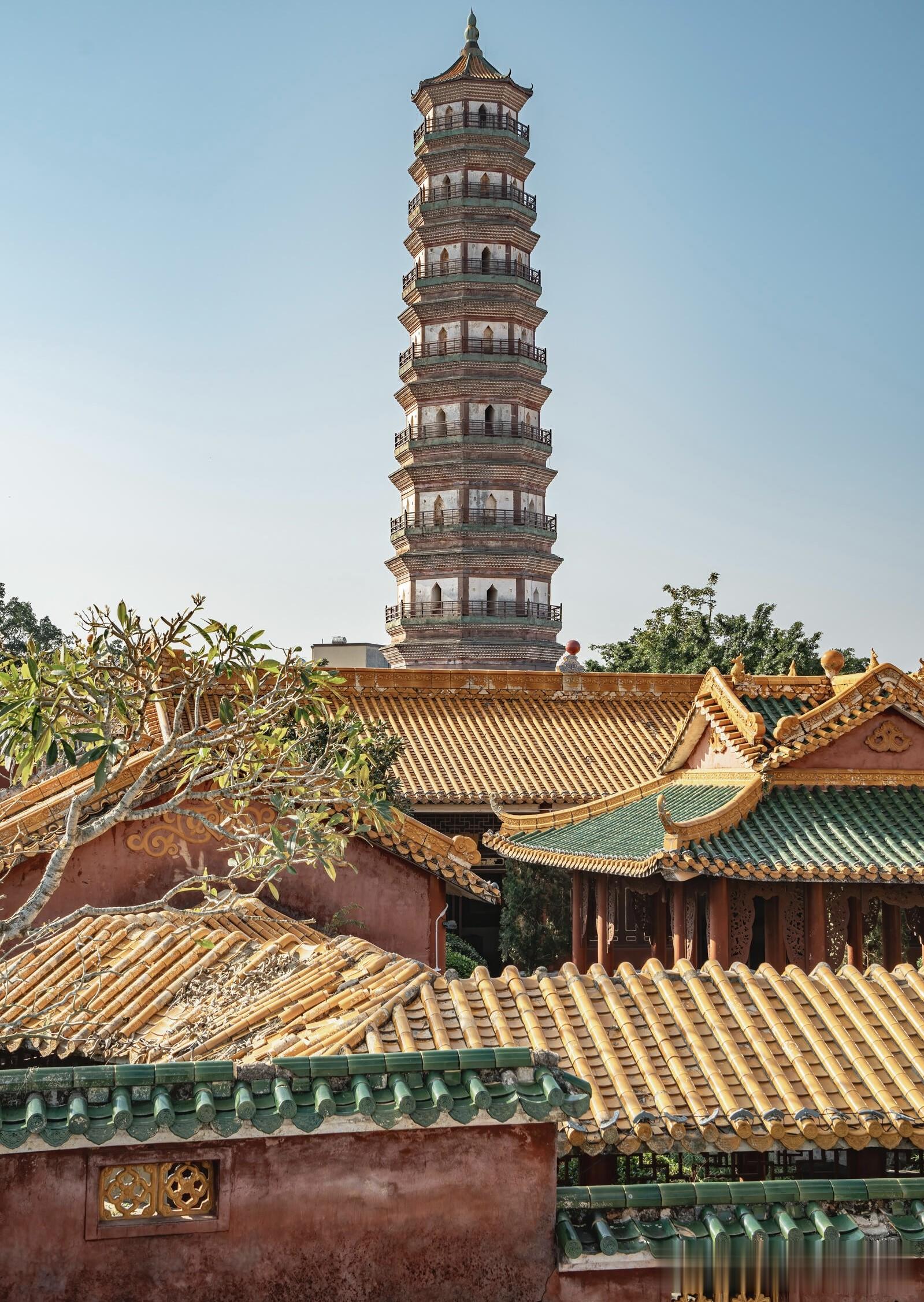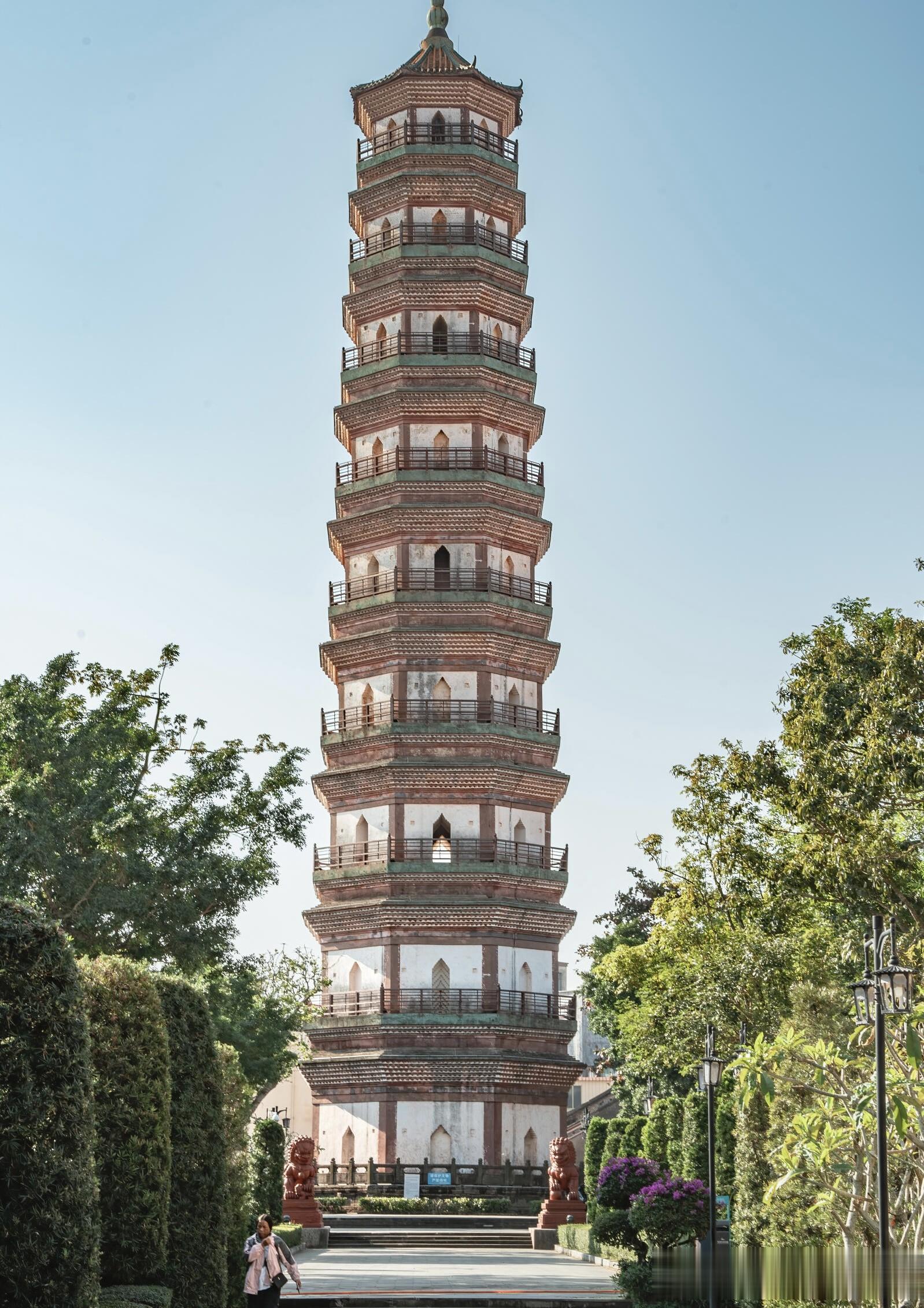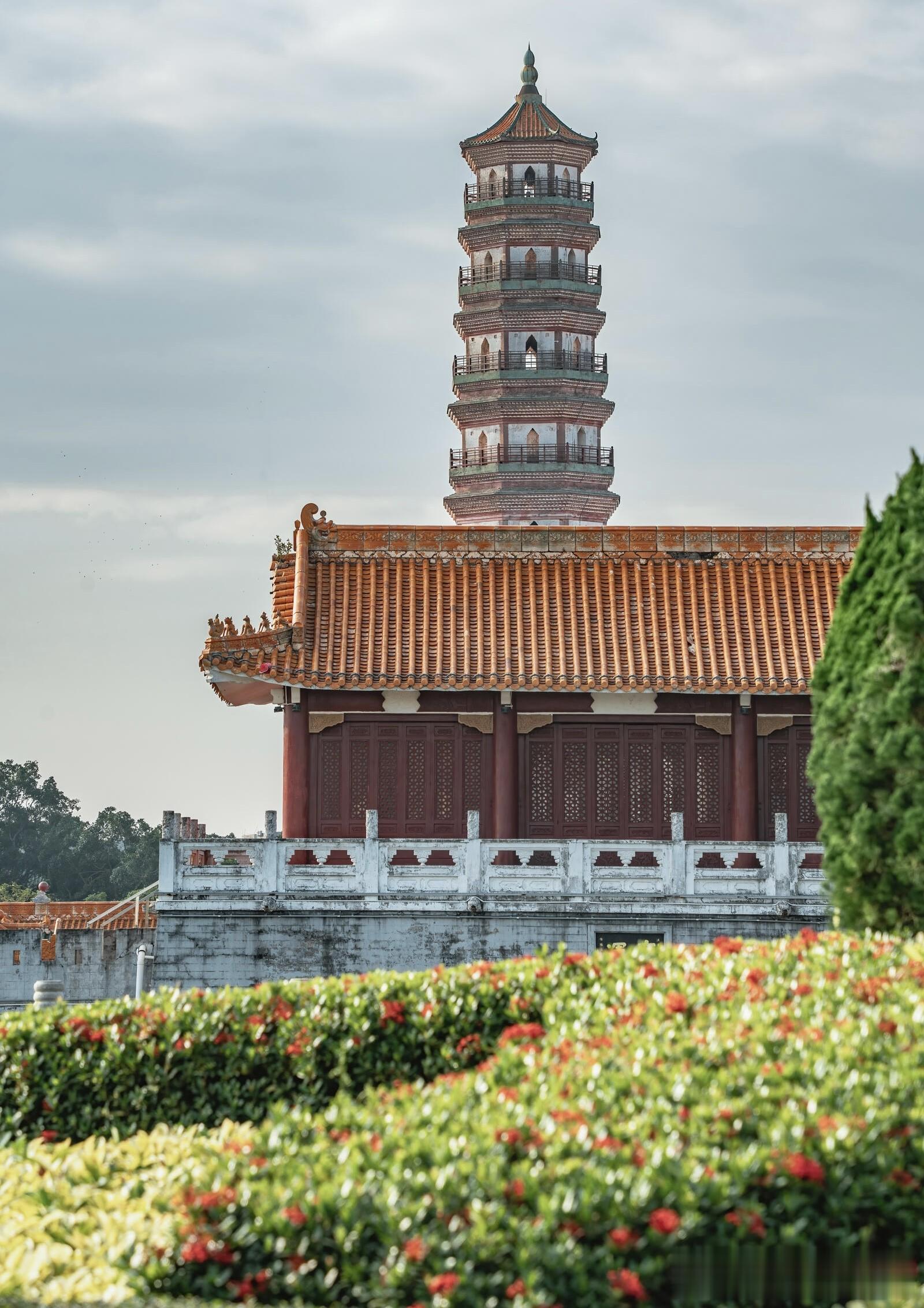 三元塔的高度是五十七米,八边形的塔身笔直向上,没有多余的装饰,却自带一股沉稳的气势。最让人惊叹的是,整座塔通体不用一根木料,全靠青砖层层叠砌而成,在没有现代机械、没有精密仪器的明代,仅凭手工与经验,能把一座近六十米高的砖塔建得如此周正坚固,本身就是一件不可思议的事。当地人口中常说的棱角牙子砖和线砖,是这座塔最独特的印记,工匠们用两种不同形制的砖交错叠砌,让塔身形成清晰又富有节奏的棱角与线条,阳光斜照时,光影在砖缝间错落,一层叠着一层,一圈绕着一圈,像是凝固的乐章,每一道棱角都藏着工匠的巧思,每一块砖都经过精准的打磨。很多人不知道,三元塔外表看是九层,内部实则有十七层,早年还能沿着狭窄的阶梯盘旋而上,一层一层往上走,视野跟着开阔,直到塔顶把雷州全城尽收眼底,青瓦连片,街巷纵横,远处的田野与河流铺展在眼前,那种登高望远的畅快,是只有亲身走过才能体会的震撼。如今为了保护古塔,登塔的通道已经封闭,这成了不少游客的遗憾,可也正是这份谨慎,让这座历经风雨、地震、雷击的古塔,能稳稳地站在时光里,继续陪伴一代又一代人。