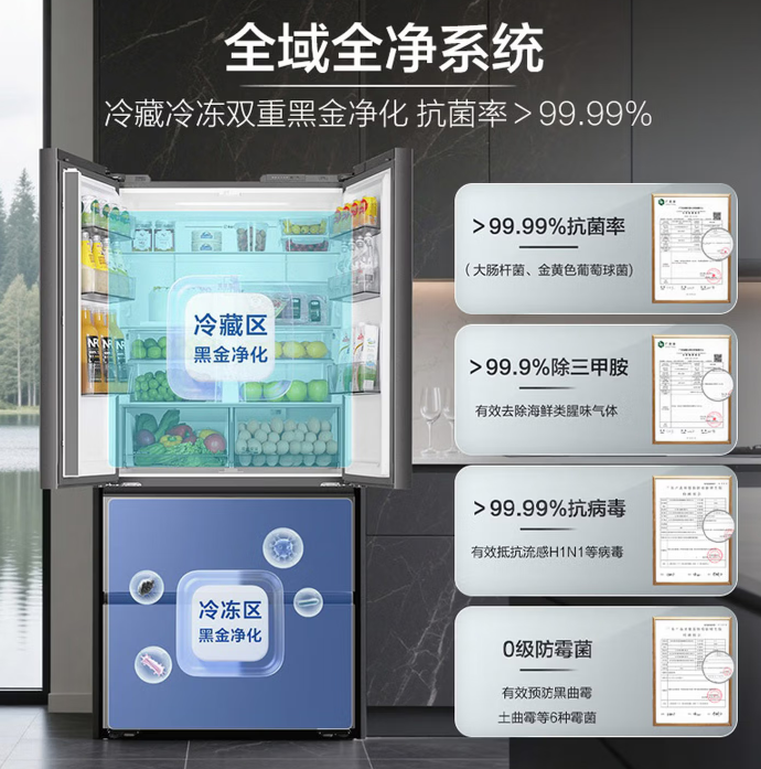 全域净化功能是这款冰箱的另一大亮点。冷藏区和冷冻区均采用黑金净化技术,抗菌率高达99.99%,能有效抑制大肠杆菌、金黄色葡萄球菌等常见细菌,同时对流感病毒也有显著去除作用。冷冻室还具备0级防霉菌能力,有效预防黑曲霉、土曲霉等霉菌滋生,为食材提供全方位的卫生保障。