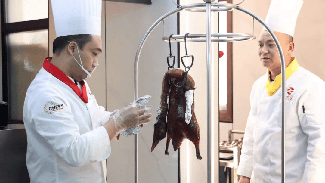 在嫩江市东方汇酒店,烤大鹅刚完成最后一道烤制工序,刚烤好的大鹅正冒着热气,金黄的表皮泛着油光,厨师麻利地将鹅肉切成均匀的薄片。为了让这道菜品达到最佳口感,厨师团队从食材选择到制作工艺都严格把控,尤其是在去腥环节下足了功夫。