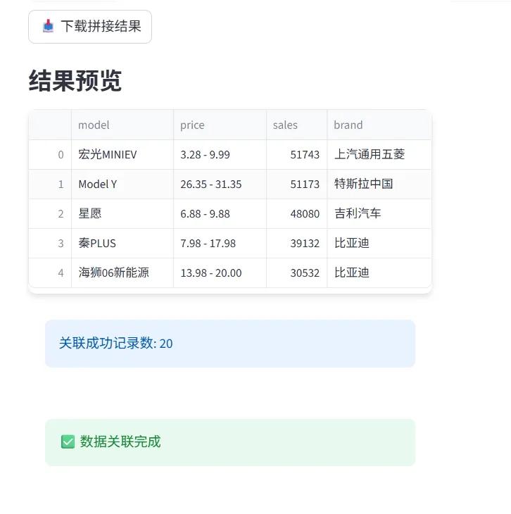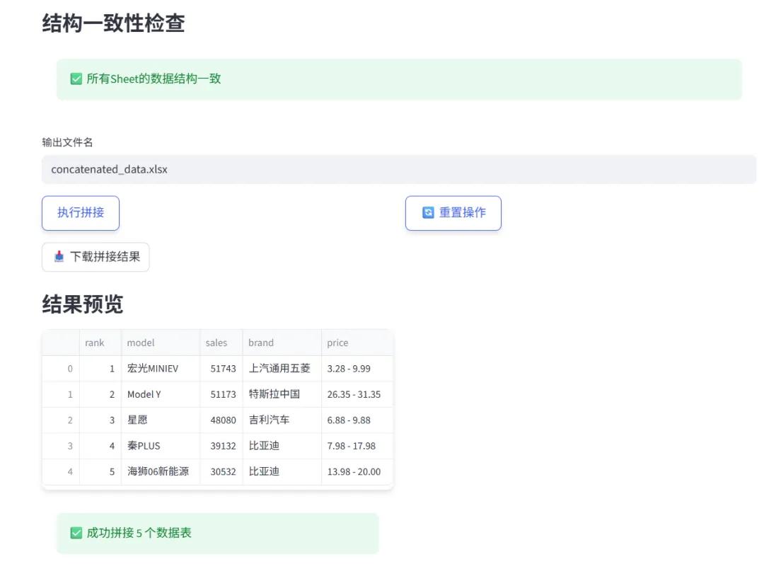 该应用会进行结构一致检查,没问题就会执行拼接,并给到结果预览,然后支持下载拼接结果,得到一张拼接好的Excel表。