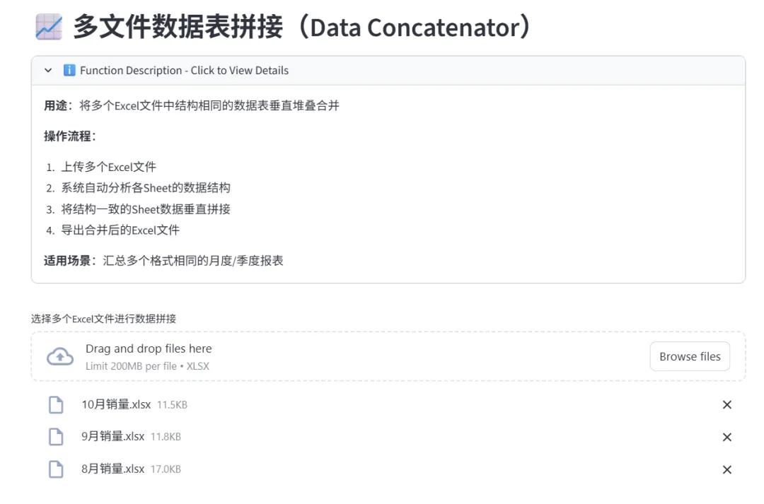 这个应用是基于Python Streamlit进行搭建的,交互比较友好,处理速度也比较快,比如说100张Excel表进行拼接,可能也就一分钟就能处理好。