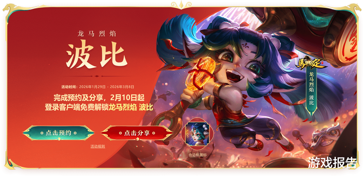 先看最实在的马年限皮龙马烈焰波比直接白送。这次的新春最大的福利很清楚,就是这款马年限定。2月10日前前往活动页面预约,等到正式上线后,登陆游戏就能直接领取这款限定皮肤以及边框图标。忘记预约也别慌,上号打3把,一样能拿。