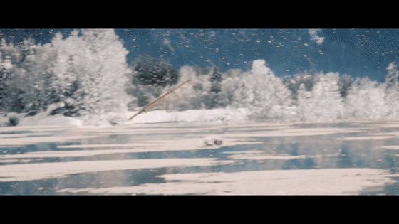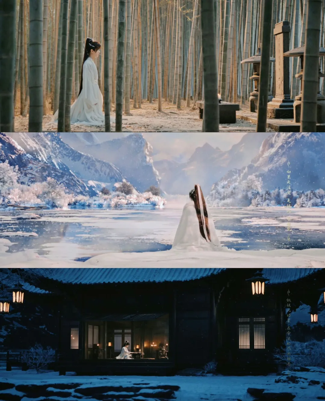 以雪地舞剑为例,漫天雪景透出纯粹的浪漫和柔美,配合黑色建筑、快节奏的剑花和慢节奏的身法,视觉上主次鲜明,以白衬黑,以缓衬急,两极感分明,各有风采。