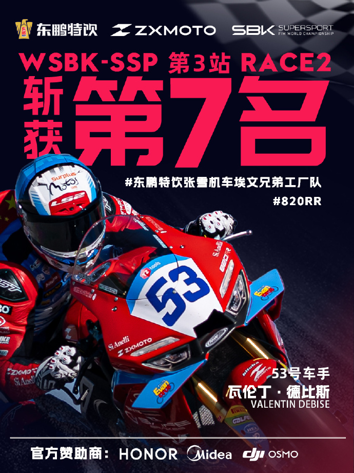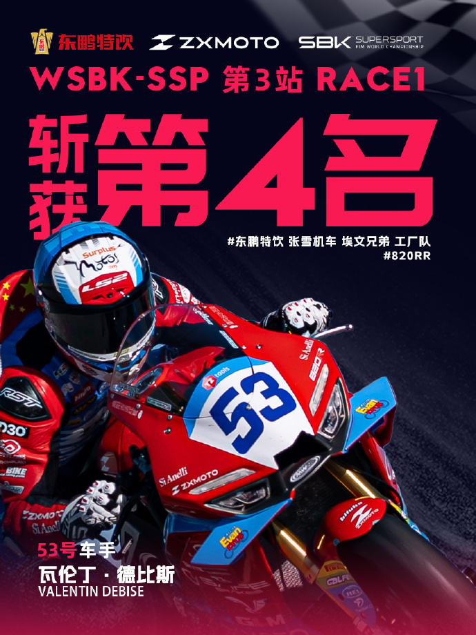 2026 年4月18-19日,WSBK荷兰站WorldSSP组别落幕,中国品牌张雪机车表现亮眼。首回合,53号车手德比斯一度领跑,末圈压线受罚,最终获第四名。次回合雨中从第10位发车,德比斯稳扎稳打、连续超车,升至第7位时,比赛因事故红旗提前结束,成绩定格第七。本站张雪机车累计积分74分,车队位列第三,展现国产赛车在顶级赛事的竞争力。