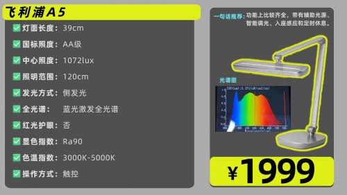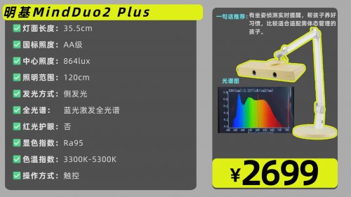 在光线光面,设计了防眩辅助光源,通过双光源配合有效减少明暗对比,降低长时间用眼时的视觉疲劳感;不过显色指数为Ra90,在色彩还原精准度上稍显不足,而且有害蓝光峰值也在1.0附近,整体的护眼效果在同价位中稍显一般。