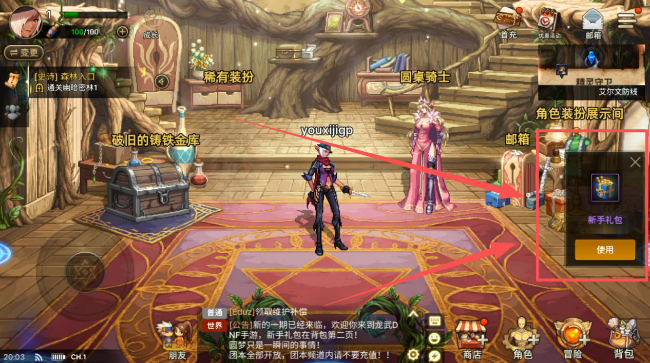 新手礼包会送点券,足够你购买礼包和副本门票,礼包里包含了时装、宠物、光环,也是提高战力的重要部分。