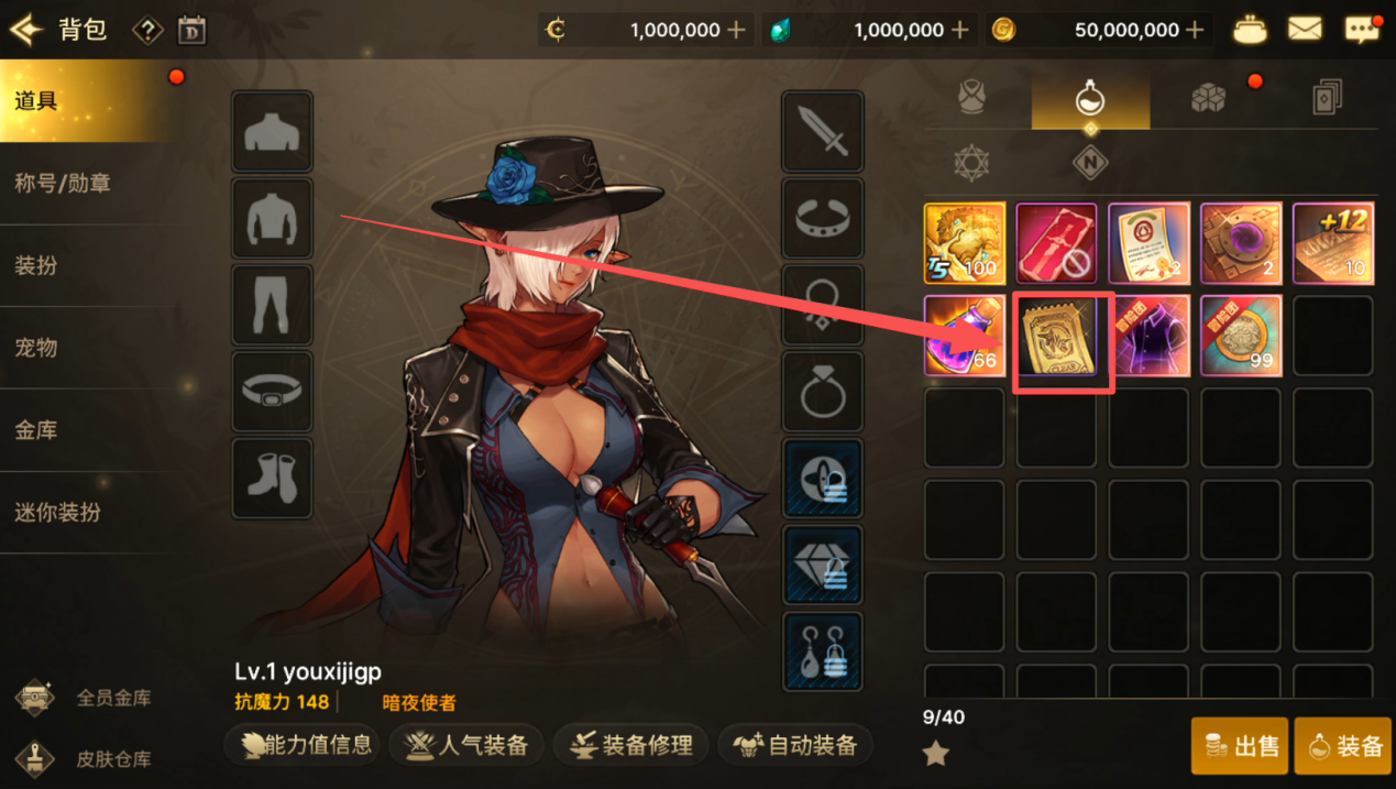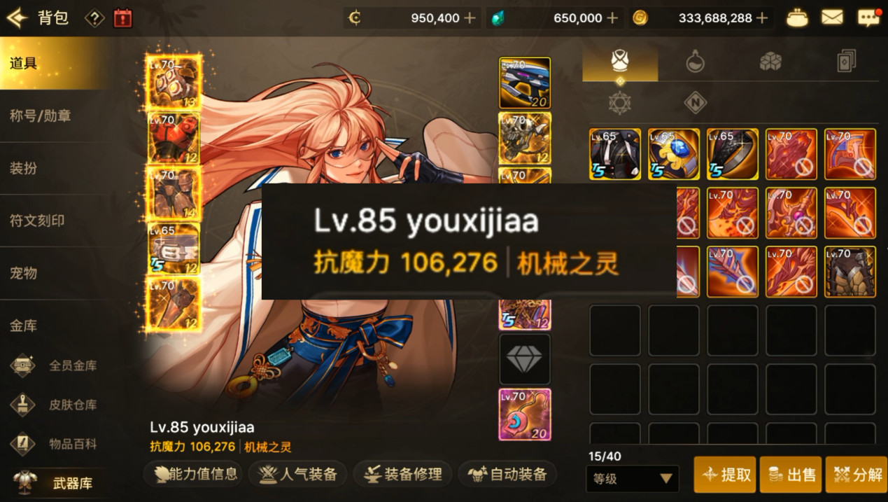这里很大机会掉落辅助装备、魔法石、耳环,这样全套装备就比较齐全了。在使用系统送的+12强化券,这样满套,就能到10万+的抗魔值。
