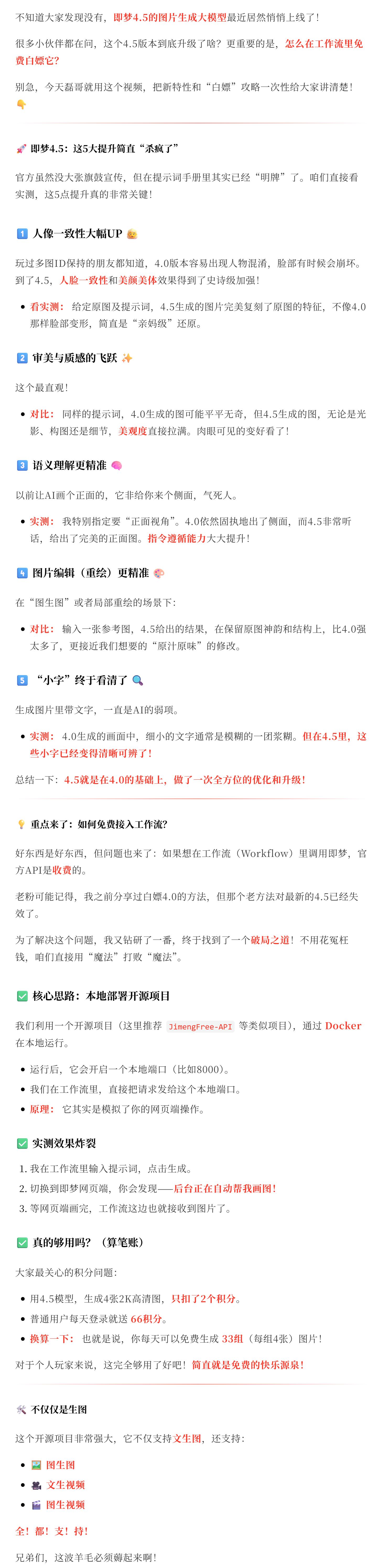 ✅ 排版精美:该加粗的地方加粗,该分段的地方分段。✅ 逻辑清晰:先讲即梦 4.5 的五大特性(12345 列得清清楚楚)。再讲实操重点:如何免费接入工作流。最后进行验证和总结。✅ 毫无 AI 味:读起来非常顺畅,完全没有那种生硬的机器翻译感。✅ 自带图标:标题还贴心地配上了 emoji,阅读体验拉满。说实话,这生成的质量绝对是生产级别的!除了偶尔需要自己配几张图让文章更丰满外,文字部分完全可以直接发布。