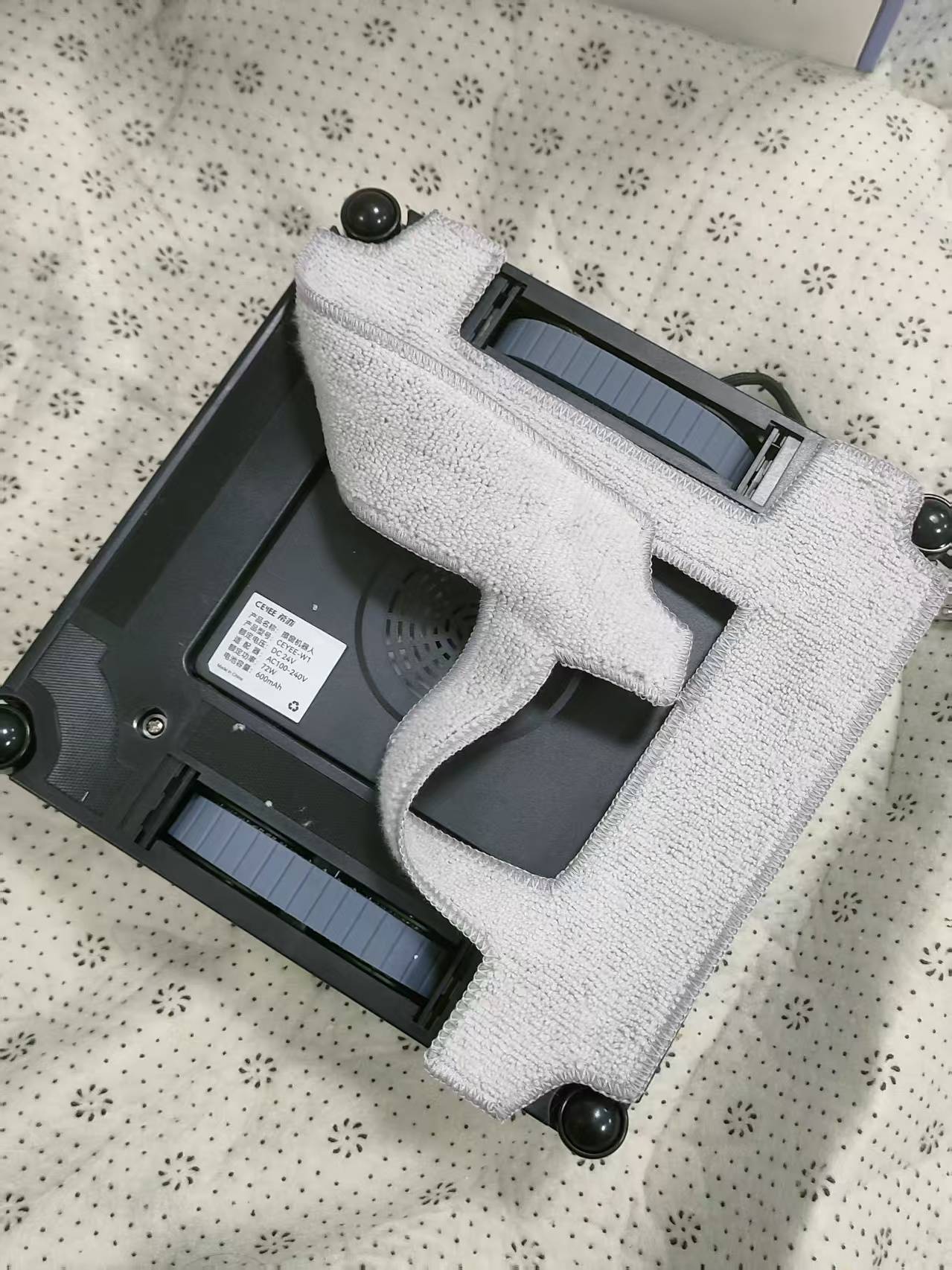 清洁方式很有特色:双向超音波喷水模拟“人口呵气”效果,朝左、右、下三个方向移动,做到“及喷及擦”,能快速溶解灰尘、轻度水垢,再配合一体式大尺寸清洁布,把污渍彻底带走。高感度边角侦测功能让机器遇到窗框边缘、扁平胶条时自动返回,防止进入危险区域;浮动吸盘设计能适应粗糙玻璃表面,就算玻璃有轻微划痕,也能平稳清洁。
