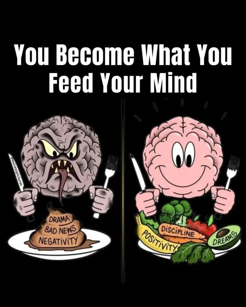 我以前看到一幅特别戳心的图——左边是一颗阴沉邪恶的脑子,盘子里的食物是:Drama(破事)、Bad news(负面新闻)、Negativity(负能量);右边是一颗健康开朗的大脑,盘子里放着dreams(梦想)、discipline(自律)和 positivity(正能量)。