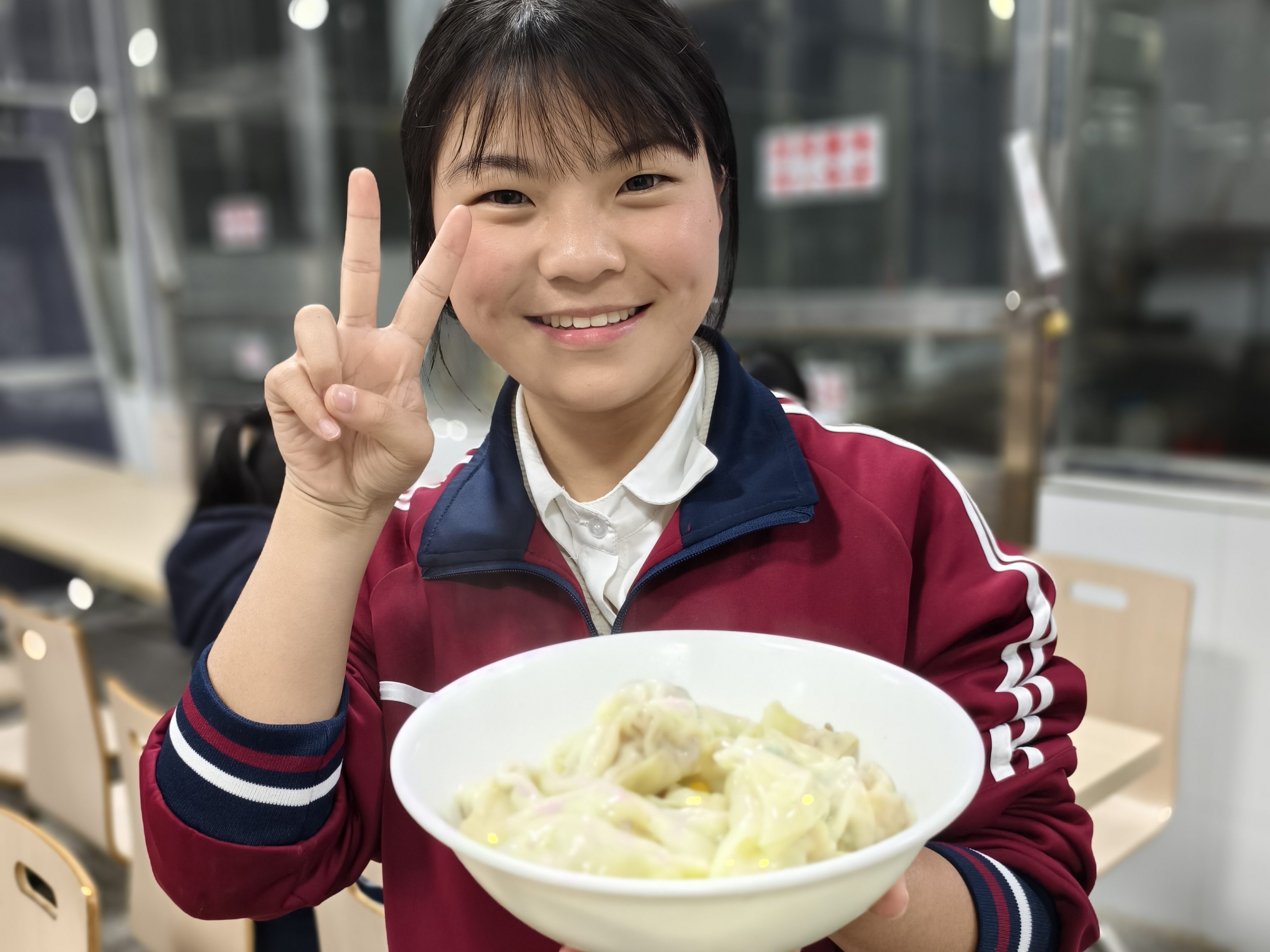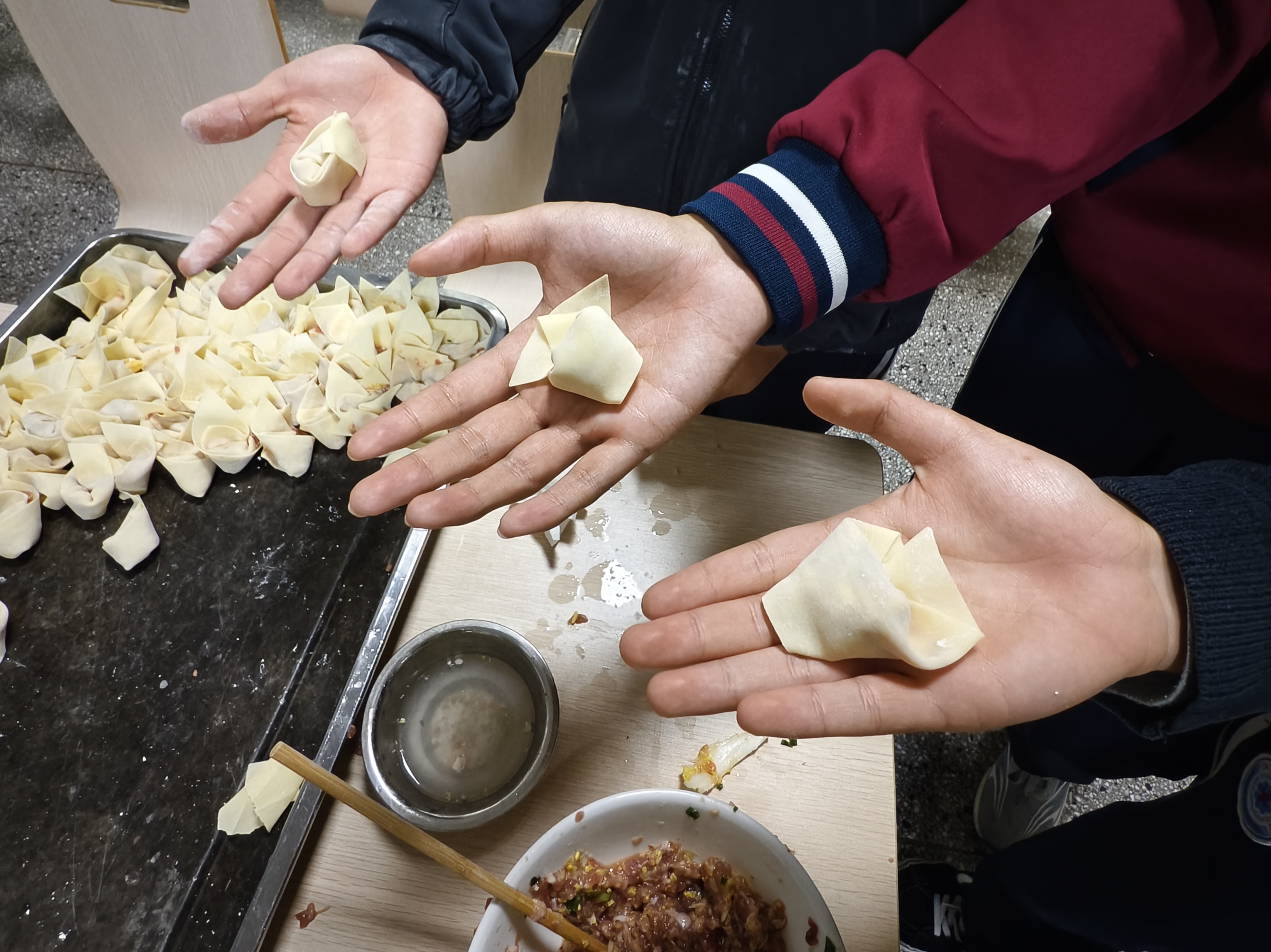 傍晚时分,食堂内一派热火朝天的劳动景象。师生们打破课堂界限,化身“面点师”,洗菜、切馅、和面、擀皮,各司其职、默契配合。平日里站在讲台上传道授业的老师,此刻手把手教学生捏出漂亮的褶子;活泼的同学们则发挥巧思,包出形态各异的创意饺子。