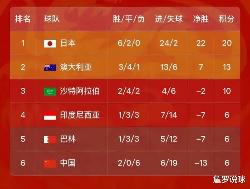 最终国足主场0-2不敌澳大利亚,吞下败仗。在国足本场输球后,球队在8轮十八强赛中取得2胜6负积6分的成绩,仍为小组垫底。值得注意的是,在国足本场失利后,国足已彻底失去以小组前二名的成绩直通美加墨世界杯的理论可能性。