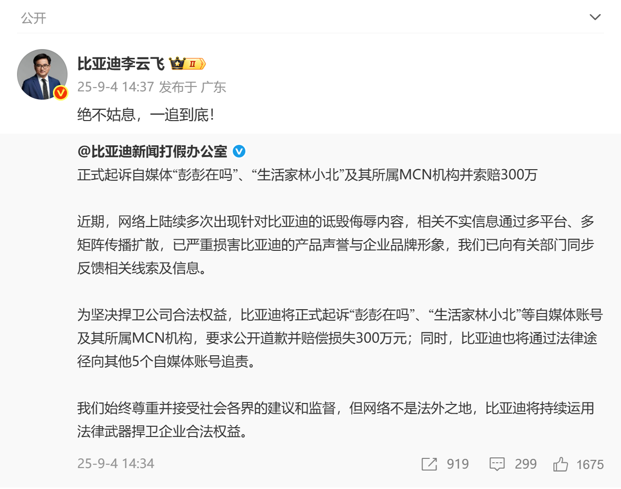 刚刚看到比亚迪对诋毁其品牌的MCN机构发起索赔300万!必须支持!网络黑稿已经不是简单的差评,而是系统性商业抹黑。这次比亚迪以法律武器反击,为行业树立榜样!希望更多企业勇敢站出来,让互联网黑产付出代价!互联网不是法外之地,造谣者必须承担后果!