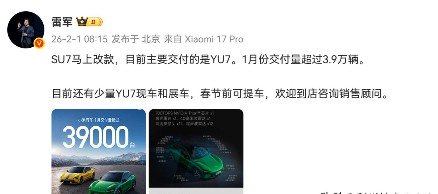 雷军回应小米汽车1月交付量3.9万——主要交付小米YU7!