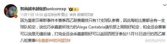 根据此前媒体人王健报道:因为皇家贝蒂斯事件本赛季西乙联赛最终只有17支球队参赛,因此每轮比赛都会有一支球队轮空,说也巧余嘉豪所效力的Alega Cantabria俱乐部上周刚好轮空,和全运会赛事可以说是无缝衔接,打完全运会余嘉豪刚好可以返回西班牙参加11月15日进行的西乙第八轮赛事