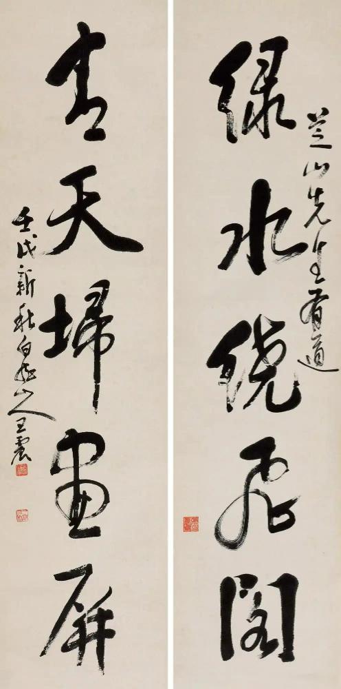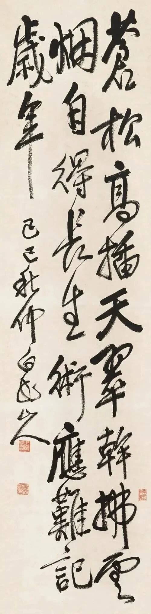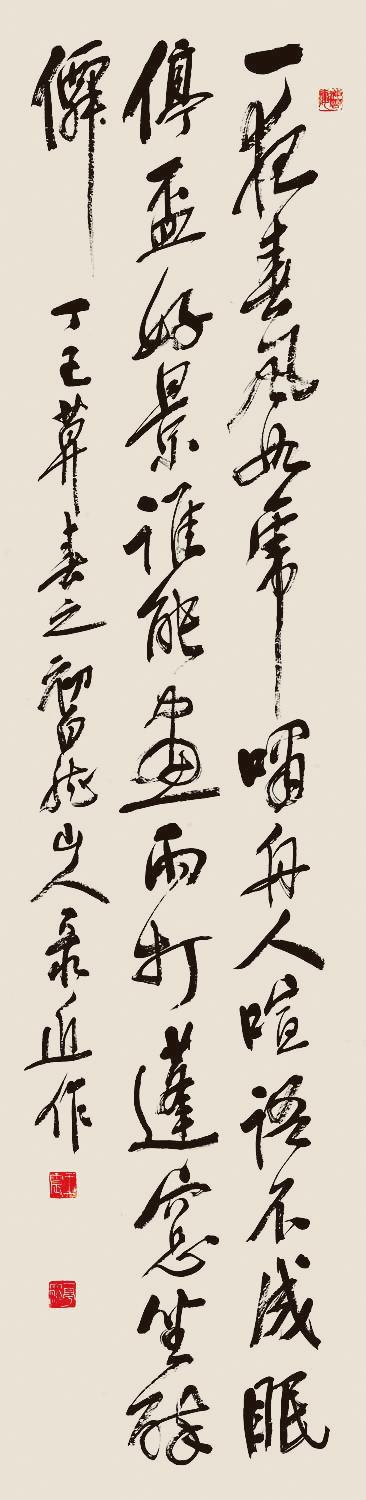 此件行草条幅(如图),内容为自作诗“一夜春风如虎啸,舟人喧语不成眠。停杯好景谁能画,雨打蓬窗坐醉仙”。署款“丁巳暮春之初,白龙山人录近作”。此作钤印很有意思,引首章一改常规,钤正方形朱文“海云楼”,却不违和。落款处盖两方白文“王震”“一亭大利”,印章“重朱”平衡了书作整体的“厚黑”。此作写于丁巳,即1917年,是年王一亭50岁,是其“后海派”风格逐渐形成的重要时期。此作不同于吴昌硕的篆籀基底,他以画法入书,同时受禅意影响,笔墨透出超脱感,是“海派”从“世俗”转向“高古”的缩影。用笔如铸生铁,提按顿挫强烈,线条沉厚劲涩,如“虎”“仙”字的长竖,兼具碑刻的刚硬与帖学的灵动。